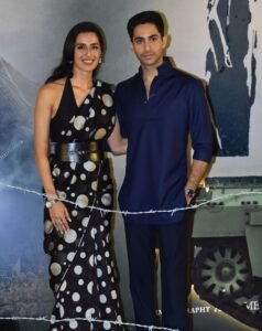 इक्कीस फिल्म से अगस्त्य नंदा लेडी लव के किरदार में है। अगस्त्य अक्षय कुमार की भांजी हैं और वो इस फिल्म से अपने एक्टिंग करियर की शुरुआत करने जा रही हैं। फिल्म के स्क्रीनिंग के दौरान वो ब्लैक और व्हाइट कलर की साड़ी में नजर आईं। वो इस लुक में बेहद खूबसूरत लग रही थी।
