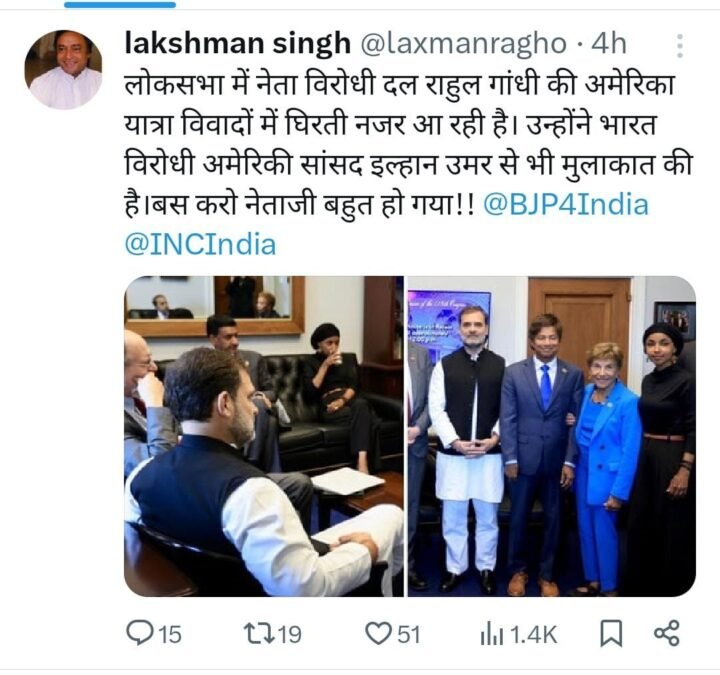 लक्ष्मण सिंह ने अपने सोशल मीडिया अकाउंट X (पूर्व में ट्विटर) पर पोस्ट करते हुए लिखा, “लोकसभा में नेता विपक्ष राहुल गांधी की अमेरिका यात्रा विवादित होती नजर आ रही है। उन्होंने भारत विरोधी अमेरिकी सांसद इल्हान उमर से भी मुलाकात की है। बस करो नेताजी, बहुत हो गया।” लक्ष्मण सिंह के इस पोस्ट ने एक बार फिर राजनीति में गर्मी पैदा कर दी है। कांग्रेस के वरिष्ठ नेता दिग्विजय सिंह के भाई अपने बयानों को लेकर अक्सर सुर्खियों में रहते हैं, और यह बयान भी उसी कड़ी में आता है।