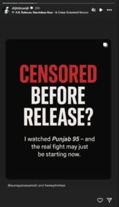 इसी विवाद के बीच दिलजीत ने इंस्टाग्राम पर एक क्रिप्टिक पोस्ट शेयर करते हुए सेंसरशिप पर निशाना साधा है। उन्होंने अपनी पहले से अटकी फिल्म ‘पंजाब 95’ का भी जिक्र किया, जो अब तक सेंसर बोर्ड की आपत्ति के कारण रिलीज नहीं हो पाई है।