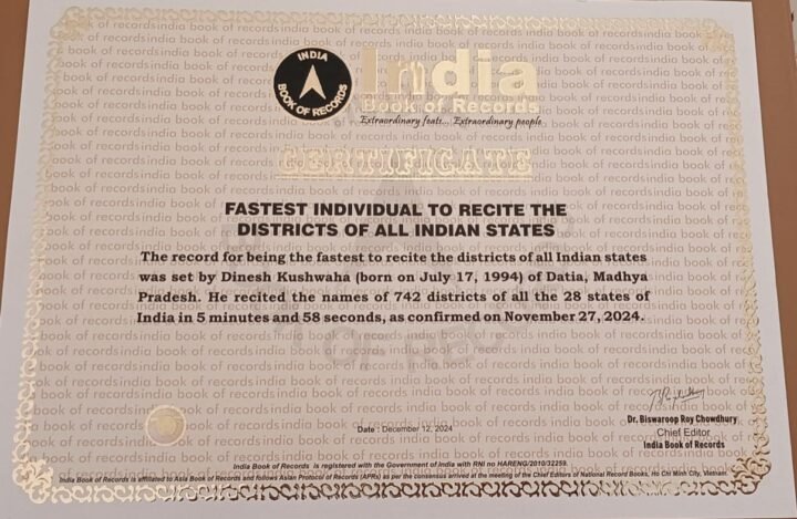 दतिया शहर में राजघाट कॉलोनी में स्थित माखनलाल चतुर्वेदी राष्ट्रीय पत्रकारिता एवं संचार विश्वविद्यालय में मास्टर ऑफ आर्ट्स इन मास कम्युनिकेशन के विद्यार्थी दिनेश कुशवाहा ने यह अनोखा रिकॉर्ड अपने नाम किया है। उन्होंने भारत के 28 राज्यों के सभी जिलों के नामों को कंठस्थ कर लिया है और मात्र 5 मिनट और 58 सेंकड में भारत के सभी जिलों के नामों को फर्राटे से बोल देते है। इनकी इस असाधारण उपलब्धि के चलते दिनेश का नाम इंडिया बुक ऑफ रिकॉर्ड्स में दर्ज हो गया। दिनेश कुशवाहा अपनी इस असाधारण उपलब्धि का सारा श्रेय विश्वविद्यालय के शिक्षक डा. नितिन भगौरिया को देते है। दिनेश ने कहा कि डा. नितिन भगौरिया ने ही उनके इस अनोखी कला को पहचाना और इडिया बुक ऑफ रिकार्ड्स में नाम दर्ज कराने के लिए प्रेरित किया।