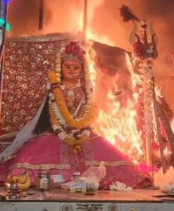 मंदिर में छत नहीं है, और यहां समय- समय पर अचानक आग लग जाती है। इस दौरान लपटें 10 से 20 फीट तक उठती हैं। चढ़ावे में रखी चुनरियां, श्रृंगार सामग्री और भोग सामग्री जलकर राख हो जाती हैं, लेकिन देवी की मूर्ति को कोई नुकसान नहीं पहुंचता है। भक्त इस घटना को “मां का अग्नि स्नान” कहते हैं।
