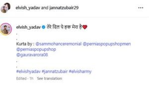 हाल ही में एल्विश यादव ने अपने ऑफिशियल अकाउंट से 2 तस्वीरें शेयर कीं, जिनमें उनके साथ टीवी और सोशल मीडिया की लोकप्रिय एक्ट्रेस जन्नत जुबैर नजर आ रही हैं। इन तस्वीरों में जन्नत ने रेड कलर की साड़ी पहन रखी है। और एल्विश यादव ने हल्का पिंक कलर का कढ़ाईदार कुर्ता और ब्लैक पैंट पहने नजर आ रहें हैं। दोनों रोमैंटिक पोज देते नजर आ रहें हैं, और साथ में काफी खूबसूरत लग रहें हैं।