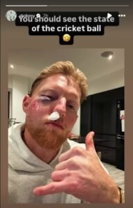 बता दें कि, जब बेन स्टोक्स को चोट लगी वो बल्लेबाजी नहीं कर रहें थे। तब वो अपने साथियों के साथ किनारे खड़े थे। तभी अचानक एक गेंद सीधे उनके चेहरे के दाहिने हिस्से पर जा लगी। उनके गाल और होंठों पर खरोंच के गहरे निशान हैं और नाक से खून बहने के कारण पट्टी (बैंडेज) लगी हुई है। इतनी चोट होने के बाद भी स्टोक्स ने मजाक के लहजे में इंस्टाग्राम पर लिखा कि- ‘आपको उस क्रिकेट गेंद की हालत देखनी चाहिए, जिससे मैं टकराया।’