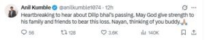 पूर्व कप्तान और स्पिनर अनिल कुंबले ने भी शोक जताते हुए लिखा, “दिलीप भाई के निधन की खबर बेहद दुखद है। ईश्वर उनके परिवार और मित्रों को इस दुःख को सहने की शक्ति दे। नयन, तुम्हारे साथ मेरी पूरी संवेदनाएं हैं।”