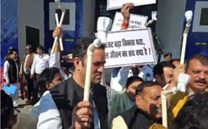 हाथ में टोंटी,पाइप लेकर विधानसभा पहुंचे कांग्रेस विधायक