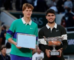 French Open 2025: पांच सेट तक चले ऐतिहासिक मुकाबले में सिनर को दी शिकस्त, ग्रैंड स्लैम में अल्कारेज ने पांचवी जीत दर्ज की। पेरिस के प्रतिष्ठित रोलां गैरो स्टेडियम में रविवार को खेले गए फ्रेंच ओपन 2025 के फाइनल मुकाबले में स्पेन के 22 वर्षीय टेनिस स्टार कार्लोस अल्कारेज ने इतिहास रच दिया। उन्होंने इटली के वर्ल्ड नंबर-1 जैनिक सिनर को बेहद संघर्षपूर्ण मुकाबले में 4-6, 6-7, 6-4, 7-6, 7-6 से हराकर अपना पांचवां ग्रैंड स्लैम खिताब जीत लिया।