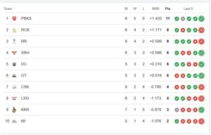 इसी के साथ गुजरात टीम पॉइंट्स टेबल पर 6 अंको से छठवें स्थान पर है, वहीं मुंबई टीम 2 अंकों से आखिर स्थान पर है।