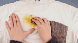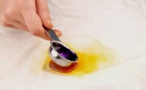 जैसे ही दाग लगे, उसे ठंडे पानी से धोएं। अब एक चम्मच सफेद सिरका और एक चम्मच लिक्विड डिटर्जेंट को मिलाएं। इस मिश्रण को दाग पर लगाएं और 10-15 मिनट तक छोड़ दें। फिर गुनगुने पानी से धो लें।