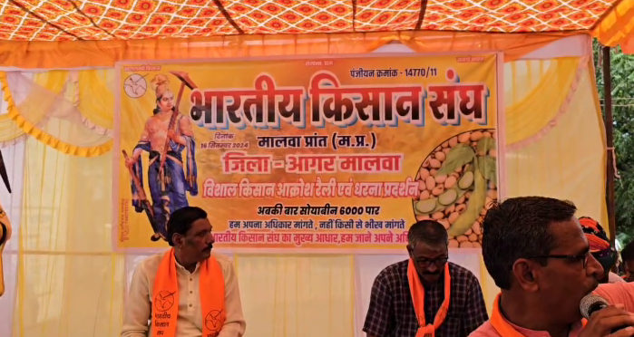 प्रदेश में किसानों की समस्याओं को लेकर आज सोमवार को आगर जिला मुख्यालय पर सैकड़ो किसानों ने मध्य प्रदेश सरकार के खिलाफ मोर्चा खोला और भव्य रैली निकाल कर अपना विरोध प्रदर्शन किया, रैली में ट्रैक्टर-ट्राली, बैलगाड़ी, आदि लेकर किसान रैली में शामिल हुए और अपना विरोध प्रदर्शन किया, सोयाबीन की फसल का भाव ₹6000 प्रति कुंडल देने सहित आदि मांगों को लेकर जिला मुख्यालय पर भारतीय किसान संघ जिला आगर मालवा के बैनर तले किसानों द्वारा प्रदर्शन किया गया है।