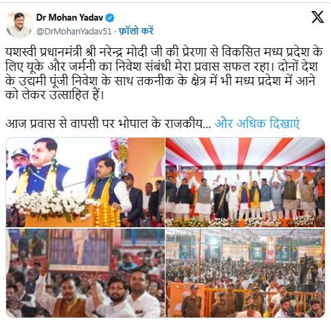 सीएम मोहन यादव ने कहा है कि प्रधानमंत्री नरेन्द्र मोदी के नेतृत्व में भारत की वैश्विक पहचान और अधिक सशक्त भी हो रही है साथ ही एक अलग छवि बन रही है. प्रधानमंत्री ग्लोबल लीडर वाली छवि का लाभ मध्यप्रदेश को यूके-जर्मनी की 6 दिवसीय यात्रा में मिला है. इसी का परिणाम है कि इस यात्रा में करीब 78 हजार करोड़ रूपये के निवेश प्रस्ताव मिले हैं. इससे प्रदेश के समग्र विकास और टेक्नो-फ्रेण्डली युवाओं को रोजगार के अधिकतम अवसर उपलब्ध कराने में मदद मिलेगी.