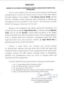 HCA अध्यक्ष राव पर फर्जी दस्तावेजों के जरिए चुनाव लड़ने और धोखाधड़ी के आरोप हैं। उनके खिलाफ IPC की धारा 465 (जालसाजी), 468 (धोखाधड़ी), 471 (नकली दस्तावेज का इस्तेमाल), 403 (अवैध संपत्ति), 409 (विश्वास का उल्लंघन) और 420 (धोखाधड़ी) में केस दर्ज किया गया है।