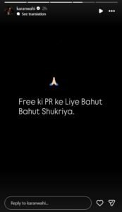 शादी की खबरों के बीच करण वाही ने अपने इंस्टाग्राम के ऑफिशियल पेज पर एक स्टोरी शेयर की और उसमें लिखा कि- ‘ फ्री की PR के लिए बहुत – बहुत शुक्रिया’। हालांकि उन्होंने डायरेक्टली शादी की बात पर कुछ नहीं कहा।