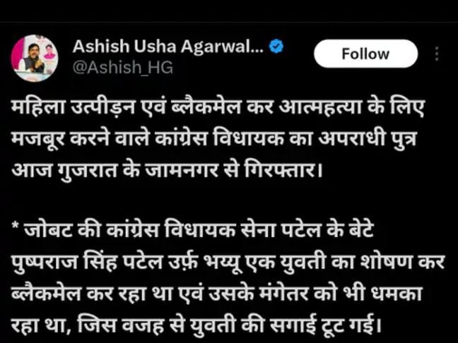 MPNEWS:आलीराजपुर में जोबट से कांग्रेस विधायक के बेटे पुष्पराज को गुजरात के जामनगर से गिरफ्तार किया गया है। पुष्पराज पटेल पर आरोप है कि उससे तंग आकर युवती ने आत्महत्या कर ली थी। उसके खिलाफ खुदकुशी के लिए उकसाने का केस दर्ज हुआ था।
