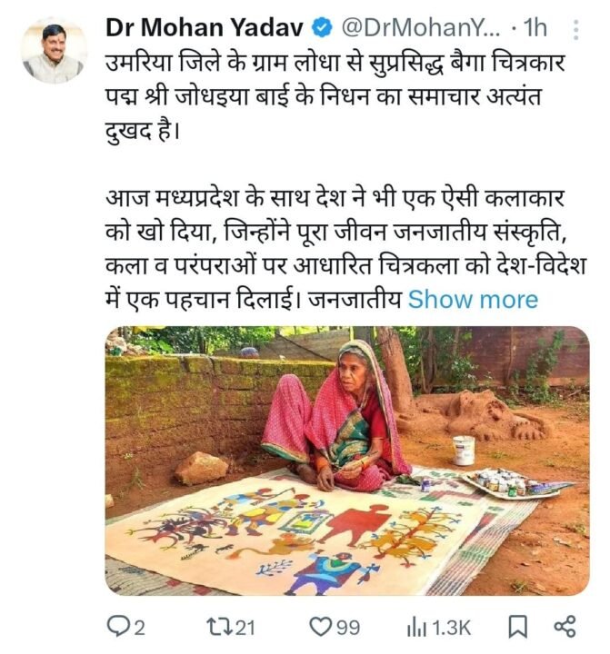 Jodhaiya Bai Death: मुख्यमंत्री डॉ. मोहन यादव ने जोधइया अम्मा के निधन पर शोक जताया है। उन्होंने सोशल मीडिया X पर लिखा कि मध्यप्रदेश ने ऐसी कलाकार को खो दिया जिन्होंने पूरा जीवन जनजातीय संस्कृति, कला व परंपराओं पर आधारित चित्रकला को देश-विदेश में एक पहचान दिलाई।