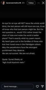 फिर करणवीर मेहरा सुनील शेट्टी का बोला गया को कोट लिखा कि – “अगली छुट्टी कश्मीर में।”