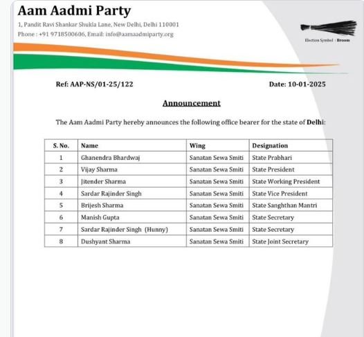 AAP ने किया सनातन सेवा समिति का किया गठन