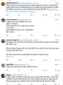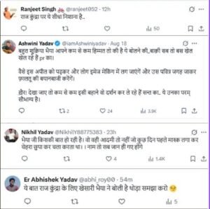 एक यूजर ने लिखा कि- ‘ये बात राज कुंद्रा के लिए खेसारी भैया ने बोली है थोड़ा समझा करो।’, एक ने लिखा कि – ‘भैया जी किसकी बात हो रही है। वो वही आदमी तो नहीं जो कुछ दिन पहले मास्क लगाकर चेहरा छुपा कर चला करता था। नाम तो सब जान ही गएं होंगे’, एक ने लिखा कि- ‘बहुत शुक्रिया भैया आपने कम से कम हिम्मत तो की है ये बोलने की,,बाक़ी सब तो बस खेल खेल रहे हैं pr का। वैसे इस अपील को पढ़कर और लोग इमेज मेकिंग में लग जाएंगें और उस पवित्र जगह जाकर फ़ालतू की बयानबाजी करेंगें। ख़ैर! देखा जाए तो कम से कम इसी बहाने वो दर्शन कर ले रहे हैं सन्त का.. ये उनका परम् सौभाग्य है।”