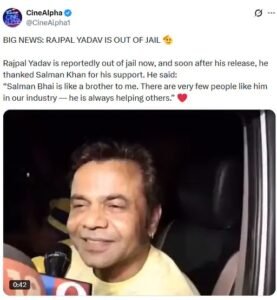 राजपाल यादव का एक वीडियो सोशल मीडिया पर जमकर वायरल हो रहा है, जिसमें वो कहते है कि- ‘सलमान भाई बड़े भाई की तरह हैं। सलमान भाई के साथ घर में बैठकर, उनके साथ बहुत खुशी महसूस हो रही है। सलमान भाई जैसे इंसान अपनी इंडस्ट्री में बहुत कम हैं। वो हमेशा लोगों के लिए खड़े रहते हैं। और हमने तो 20 साल से लगातार सलमान भाई के साथ 10-12 फिल्में की हैं। मैं पूरी तरह से राहत महसूस कर रहा हूं और उनके अच्छे की कामना करता हूं।’