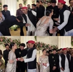 वहीं अखिलेश यादव ने कुलदीप को गले लगाकर शादी की बधाई दी और कुलदीप और वंशिका ने उनका भी पैर छूकर आशीर्वाद लिया।