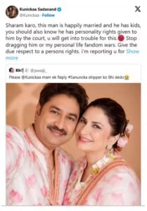 यूजर ने एक्ट्रेस कुनिका सदानंद की कुमार सानू के साथ AI जनरेटेड फोटो एक्स पर शेयर करते हुए कुनिका को टैग किया और लिखा कि- “कृपया मैम, #Sanuncka को भी एक रिप्लाई दे दीजिए।”