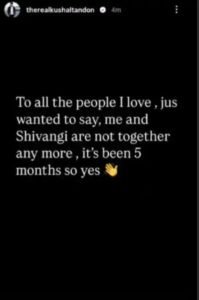 कुशाल टंडन ने अपनी इंस्टाग्राम स्टोरी पर लिखा, “जिन लोगों से मैं प्यार करता हूं, उन्हें बस यही कहना चाहता हूं कि अब मैं और शिवांगी साथ नहीं हैं। यह बात 5 महीने पुरानी है।” कुछ ही मिनटों में उन्होंने यह पोस्ट हटा दी, जिससे उनके फैंस में असमंजस की स्थिति बन गई।