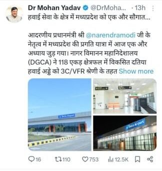 सीएम डॉ. मोहन यादव ने इस महत्वपूर्ण उपलब्धि पर खुशी व्यक्त करते हुए कहा, “प्रधानमंत्री नरेंद्र मोदी के मार्गदर्शन में देश और प्रदेश लगातार प्रगति के पथ पर अग्रसर है। हम दतिया और सतना हवाई अड्डों के जल्द उद्घाटन के लिए तैयार हैं, और मध्य प्रदेश वासियों की ओर से प्रधानमंत्री जी का धन्यवाद अर्पित करते हैं।”