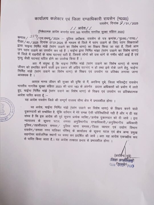 मध्य प्रदेश के रायसेन कलेक्टर अरविंद कुमार दुबे ने चायनीज मांझे पर प्रतिबंध के आदेश जारी कर दिये है।पुलिस अधीक्षक पंकज कुमार पांडे ने ओबैदुल्लागंज में चायनीज माँझे से महिला की गर्दन कटने के बाद कलेक्टर काे पत्र लिखा था जिस पर संज्ञान लेते हुये रायसेन कलेक्टर अरविंद कुमार दुबे ने चायनीज माँझे पर प्रतिबंध लगाया है।