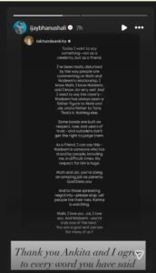 जय भानुशाली ने अपने इंस्टाग्राम पर अंकिता की स्टोरी रिपोस्ट करते हुए लिखा कि- ‘धन्यवाद अंकिता, मैं आपकी कही हर बात से सहमत हूं।’