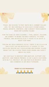 “हालांकि, हम अलग-अलग रास्तों पर चल रहे हैं, इस कहानी में कोई विलेन नहीं है और इस डिसीजन से कोई निगेटिविटी नहीं जुड़ी है। कोई भी निष्कर्ष निकलने से पहले, कृपया जान लें कि हम नाटक से ऊपर शांति को चुनते हैं।हम हमेशा की तरह एक दूसरे का सम्मान करते रहेंगे, एक दूसरे का समर्थन करते रहेंगे और दोस्त बने रहेंगे। आपसी सम्मान के साथ, हम आपसे आगे बढ़ते हुए सम्मान, प्रेम और दया की कामना करते हैं।”