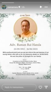 मनारा ने पोस्ट में यह भी लिखा कि – उनके पिता का अंतिम संस्कार 18 जून को मुंबई के अंधेरी वेस्ट स्थित अंबोली श्मशान भूमि में किया जाएगा।