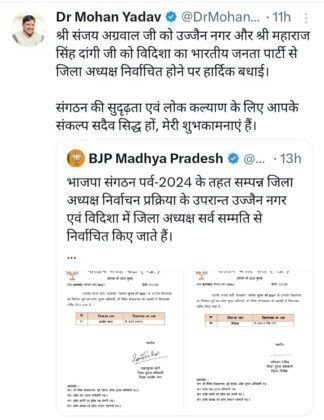 Mp Bjp: सीएम डॉ. मोहन यादव ने सोशल मीडिया प्लेटफॉर्म X पर लिखा, श्री संजय अग्रवाल जी को उज्जैन नगर और श्री महाराज सिंह दांगी जी को विदिशा का भारतीय जनता पार्टी से जिला अध्यक्ष निर्वाचित होने पर हार्दिक बधाई। संगठन की सुदृढ़ता एवं लोक कल्याण के लिए आपके संकल्प सदैव सिद्ध हों मेरी शुभकामनाएं हैं।