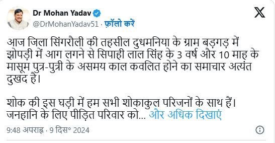 हादसे के बाद मध्य प्रदेश के सीएम डॉक्टर मोहन यादव ने सोशल मीडिया के X प्लेटफार्म पर लिखा, सिंगरौली की तहसील दुधमनिया के ग्राम बड़गड़ में झोपड़ी में आग लगने से सिपाही लाल सिंह के 3 वर्ष और 10 माह के मासूम पुत्र-पुत्री के असमय काल कवलित होने का समाचार अत्यंत दुखद है.शोक की इस घड़ी में हम शोकाकुल परिजनों के साथ हैं.मध्य प्रदेश सीएम डा. मोहन यादव ने आगजनी में दो बच्चों को खोने वाले पीड़ित परिवार को मुख्यमंत्री स्वेच्छानुदान मद से 4-4 लाख की सहायता राशि मुआवजा देने का ऐलान किया है और नियमानुसार अन्य कोई आर्थिक मदद प्रदान करने के निर्देश दिए हैं और बाबा महाकाल से शोकाकुल परिजनों को दुःख सहन करने की शक्ति प्रदान की प्रार्थना की.