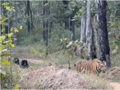 बाघ काफी देर तक बैठने के बाद उठाकर खड़ा हुआ और आगे की ओर बढ़ने लगा. लेकिन सामने से भालुओं को आता देख बाघ तुरंत पीछे पलटा और दुम दबाकर भागने लगा. जिप्सी में बैठकर जंगल सफारी कर रहे पर्यटकों ने पूरे घटनाक्रम को अपने मोबाइल में कैद कर लिए. जिसे सोशल मीडिया पर खूब शेयर किया जा रहा है. सतपुड़ा टाइगर रिजर्व के मढ़ई रेंजर पीएम ठाकूर ने कहा, “कल मढ़ई में कुछ पर्यटक पहुंचे हुए थे. उन्हें घूमने के दौरान यह मंजर देखने को मिला है. इसका वीडियो लोगों ने बना लिया था.”