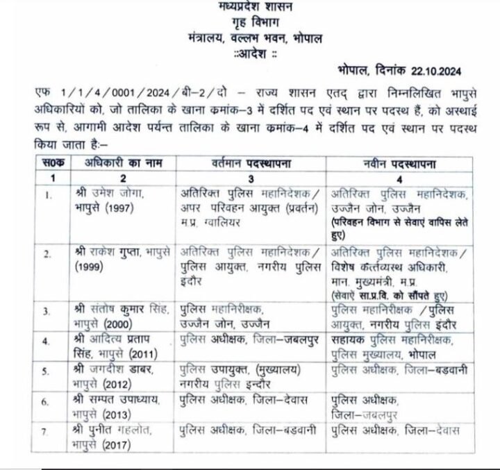 MP Transfer of IPS : आधी रात को 7 IPS का ट्रांसफर