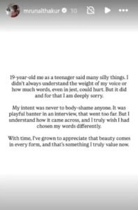 एक्ट्रेस मृणाल ने 14 अगस्त को अपने सोशल मीडिया के इंस्टाग्राम अकाउंट पर स्टोरी डालकर एक नोट शेयर किया, उसमें उन्होंने लिखा कि- “19 साल की उम्र में मैंने कई बेवकूफी भरी बातें की थीं। मुझे समझ नहीं था कि मेरे शब्दों का क्या असर होगा। मजाक में कही गई बातें भी किसी को चोट पहुंचा सकती हैं, और ऐसा हुआ। इसके लिए मैं दिल से माफी चाहती हूं। मेरा इरादा कभी भी किसी की बॉडी शेमिंग करने का नहीं था।”