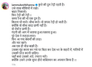 मुकेश खन्ना ने समय रैना की तस्वीर शेयर करते हुए कैप्शन में लिखा कि, ‘ समय रैना, तू गधे पर बैठने लायक है और वो भी मुंह काला करके।’ उन्होंने कैप्शन में लिखा है,‘कुत्ते की दुम टेढ़ी रहती है। उसे लाख शीशियों में रखो। बाहर निकालो, फिर टेढ़ी की टेढ़ी!! समय रैना की भी एक दुम है। कितना भी मारो, सीधा करो, वो वापस टेढ़ी हो जाती है क्योंकि वो सीधा-सादा प्राणी नहीं है। वो रोस्टेड प्राणी है।’
