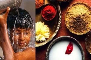 नरक चतुर्दशी की सुबह ब्रह्म मुहूर्त में उठकर पूरे शरीर पर तिल का तेल लगाकर मालिश करें और उसके बाद उबटन से स्नान करें। इसे अभ्यंग स्नान कहा गया है। ऐसा करने से नकारात्मक ऊर्जा दूर होती है, पापों का नाश होता है और दीर्घायु का वरदान मिलता है।
