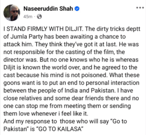 “मैं दिलजीत दोसांझ के साथ पूरी मजबूती से खड़ा हूं।” – नसीरुद्दीन