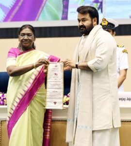 मलयालम के दिग्गज एक्टर मोहनलाल को फिल्म इंडस्ट्री में उनके योगदान के लिए गौरवपूर्ण दादासाहेब फाल्के अवॉर्ड से सम्मानित किया गया, राष्ट्रपति मूर्मू ने उन्हें गोल्डेन शॉल ओढ़ाई और गोल्डन लोटस अवार्ड दिया। सभी ने एक्टर को स्टैंडिंग ओवेशनल भी दिया गया।