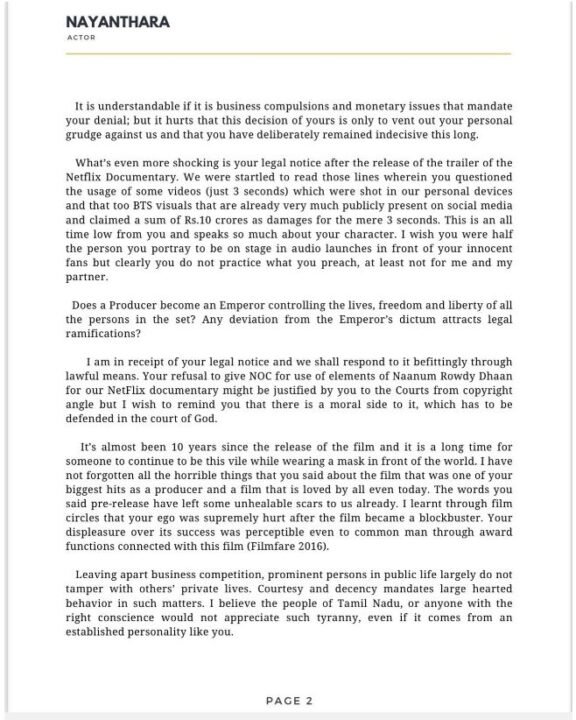 नयनतारा ने इस नोटिस का कड़ा विरोध किया और कहा कि अब यह मामला कोर्ट में जाएगा। उन्होंने धनुष के खिलाफ बगावत करते हुए कहा कि वो कानूनी तरीके से इस मामले का हल निकालेंगी।