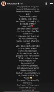 ‘अब मैं अपनी पर्सनल लाइफ के बारे में बात नहीं करूंगी, भाईसाहब। बेचारी इमोशनल नेहू इस दुनिया के लिए बहुत ज्यादा इमोशनल है। सॉरी और धन्यवाद मेरे नेहार्ट्स। चिंता मत करो, मैं जल्द ही धमाकेदार वापसी करूंगी। ढेर सारा प्यार।’