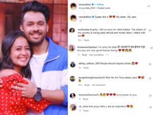 नेहा का सपोर्ट करने पर टोनी कक्कड़ की फैंस ने की तारीफ एक ने लिखा कि- भाई हो तो टोनी कक्कड़ जैसा..❤️😍🔥, वही दूसरे ने लिखा – more power to you, एक ने लिखा कि- Exactly. I felt so sorry for neha Kakkar. The citizen of my country is losing basic ethical and moral views. I stand with her♥️, कुछ इस तरह से यूजर्स ने किया सपोर्ट।
