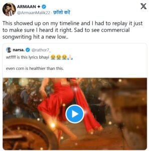 मशहूर म्यूजिक कम्पोजर अरमान मलिक ने इस गाने के लिरिक्स की आलोचना करते हुए सोशल मीडिया के एक्स पर लिखा कि- ,’ये गाना मेरी टाइमलाइन पर दिखा और मैंने इसे रीप्ले किया, सिर्फ ये सुनिश्चित करने के लिए कि क्या मैं सही सुना या नहीं, दुख की बात है कि कमर्शियल सॉन्ग राइटिंग का स्तर इतना गिर गया है।’