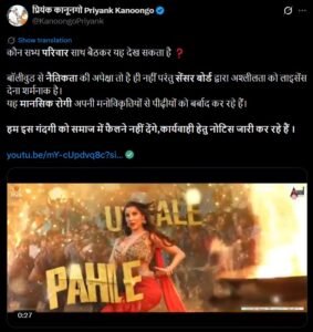 अरमान मलिक के अलावा नेशनल ह्यूमर राइट्स कमीशन के सदस्य प्रियांक कानूनगो ने भी इस गाने पर अपनी नाराजगी को जाहिर की, उन्होंने पोस्ट में लिखा कि- ‘कौन सभ्य परिवार साथ बैठकर ये देख सकता है?’बॉलीवुड में नैतिकता की अपेक्षा तो है ही नहीं परंतु सेंसर बोर्ड द्वारा अश्लीलता को लाइसेंस देना शर्मनाक है। ये मानसिक रोगी अपनी मनोविकृतियों से पीढ़ीयों को बर्बाद कर रहे हैं। हम इस गंदगी को समाज में फैलने नहीं देंगे, कार्यवाही हेतु नोटिस जारी कर रहे हैं।’