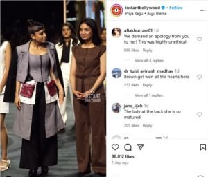 नुसरत के मिसबिहेव के बाद भी मॉडल ने उनके साइड देखकर मुस्कुराई। लेकिन नुसरत ने एक स्माइल तक नहीं दी, और उन्हें पीछे कर दिया, जिसे देखकर यूजर्स ने नुसरत असभ्य बताया, यूजर ने कमेंट करते हुए एक ने लिखा कि – “फालतू का एटीट्यूड है”, जबकि दूसरे ने लिखा- “हम आपसे उससे माफी मांगते हैं! यह बेहद अनैतिक था।” एक ने लिखा कि – That brown dress girl ko side kiya kyunki wah best thi’ एक ने लिखा कि- 😂😂😂😂 iseliye abhi bhi shine nahi kar payi hai industry main, एक ने लिखा कि – ‘We demand an apology from you to her! This was highly unethical’ कुछ इस तरह से यूजर ट्रोल कर रहें है।