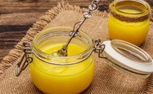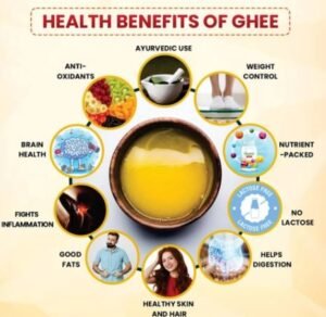 घी में प्राकृतिक एंटीऑक्सीडेंट और वसा होते हैं, जो त्वचा को नमी और चमक देते हैं। नियमित सेवन से बालों में मजबूती आती है और बाल झड़ने की समस्या कम होती है।