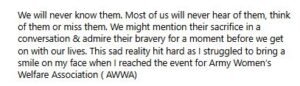 “हम उन्हें कभी जान नहीं पाएंगे। कई उन्हें कभी नहीं सुन सकेंगे या उनके बारे में नहीं सोच पाएं, याद नहीं कर सकेंगे। शायद हम बातचीत में उनका जिक्र करेंगे, उनकी वीरता की तारीफ करेंगे और फिर अपने जीवन में लौट जाएंगे। यह दुखद सच्चाई तब और भी ज़्यादा गहरी हो गई जब मैं आर्मी वीमेन वेलफ़ेयर एसोसिएशन (AWWA) के कार्यक्रम में पहुँची और अपने चेहरे पर मुस्कान लाने की मशक्कत कर रही थी।”