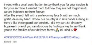 “इस कार्यक्रम में मैं उन महिलाओं से मिली जो इन पुरुषों को हर दिन और हर पल याद करती हैं। मैं उनके बच्चों से मिली और मैंने उनकी मुस्कान देखी। कोई शिकायत नहीं थी और कोई आंसू नहीं थे! बस गर्व, ताकत और बलिदान था। उस सभागार में इतनी बहादुरी थी कि मैं शब्दों से परे विनम्र हो गई। इन वीर नारियों और उनके परिवारों के साथ मंच साझा करना वास्तव में मेरे लिए सम्मान की बात थी🙏”