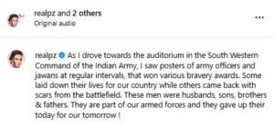 आखिर में प्रीति ने लिखा, “कार्यक्रम के बाद मैं अपने चेहरे पर मुस्कान और दिल में बहुत कृतज्ञता के साथ वापस लौटी। मुझे पता है कि हमारा देश सुरक्षित हाथों में है जब तक कि इन जैसे हीरो हमारी सीमाओं की रक्षा करते हैं। मैंने अपना काम किया और मुझे पूरी उम्मीद है कि आप में से हर कोई हमारे रक्षा बलों के परिवारों को धन्यवाद कहने का कोई तरीका ढूंढकर अपना काम कर सकते है 🙏 जय हिंद 🇮🇳❤️”