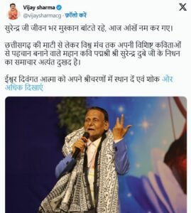 छत्तीसगढ़ के उपमुख्यमंत्री विजय शर्मा ने गहरा शोक व्यक्त किया और अपने सोशल मीडिया अकाउंट पर लिखा –